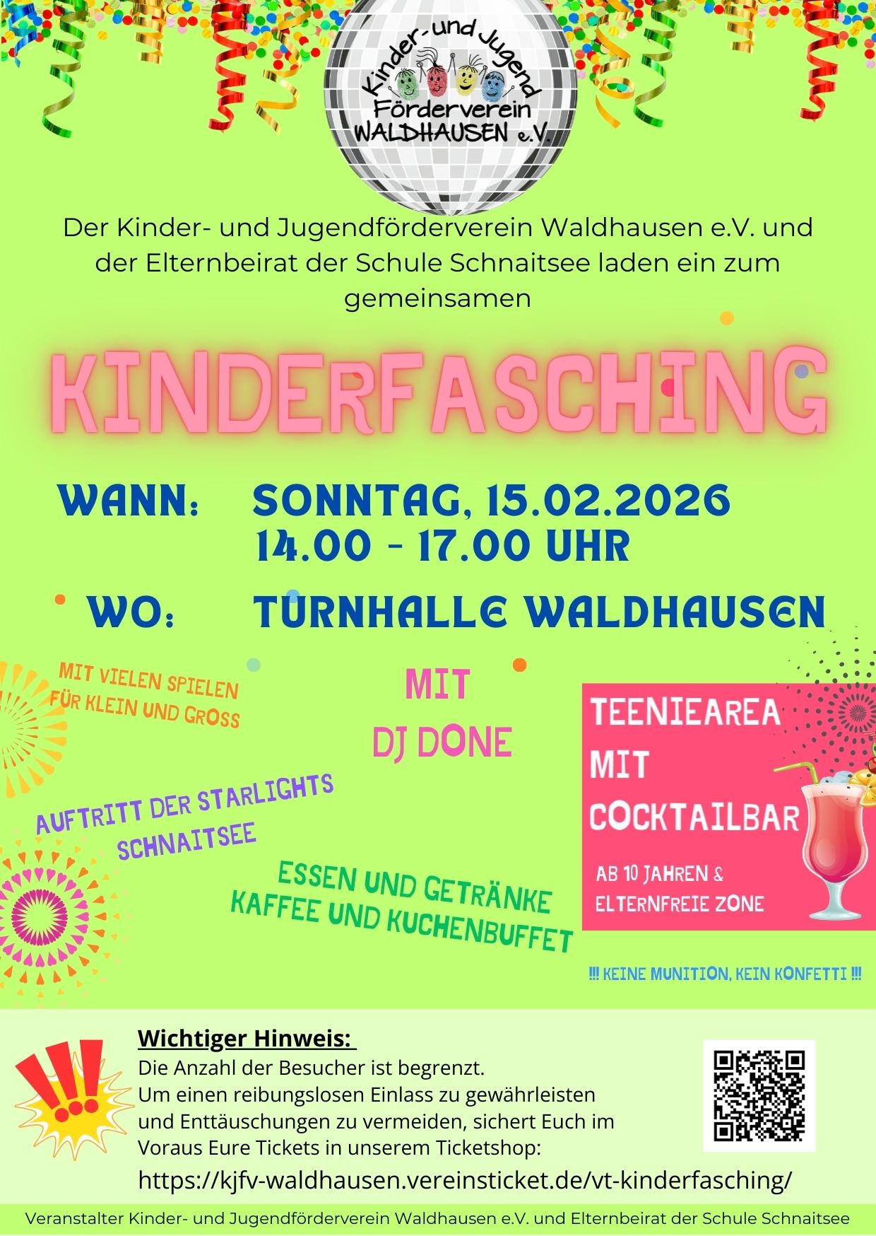 Der diesjährige Kinderfasching findet am Sonntag 15.02.2026 in der Turnhalle Waldhausen statt. Tickets können wie immer im Voraus in unserem Ticketshop gebucht werden.